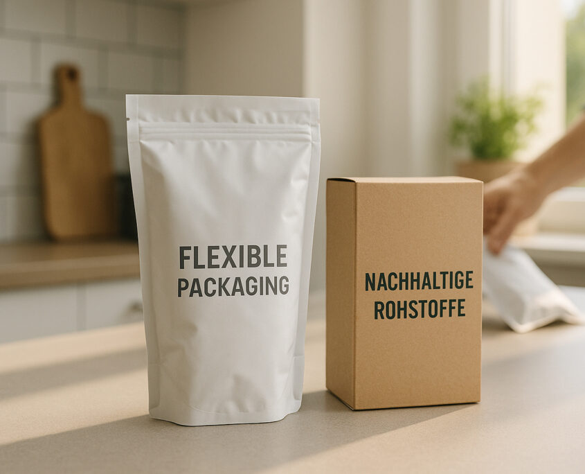 Flexible Verpackung neben einem Karton mit der Aufschrift "Nachhaltige Rohstoffe"